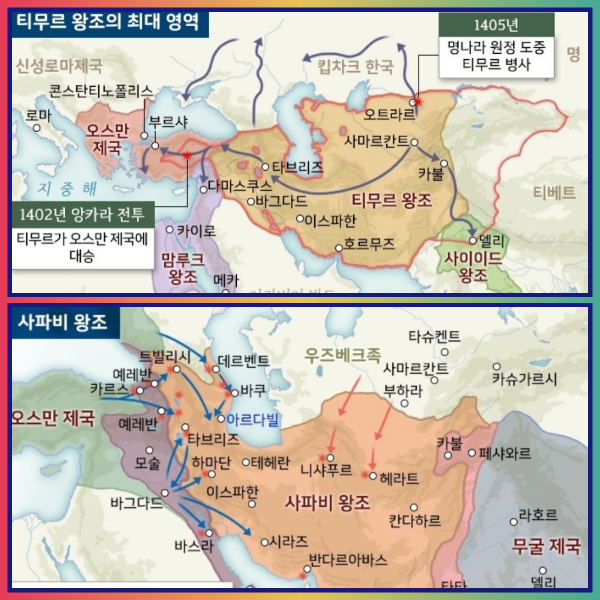 1299년 약했던 오스만튀르크가 침략하여 훌라구칸(일칸국, 울루스)이 먼저 망하고 몽골제국은 분열된다. 티무르(1369~1500)가 몽골제국의 옛 명예 회복을 꿈꾸며 중앙아시아 쪽에 티무르제국을 세우지만 단합이 안되고 왕좌싸움을 두고 계속된 분열과 반란이 일어나고 혼란의 시기를 맞는다. 이런 시기 페르시아의 후예 이란이 사파비 왕조(1502~1736)가 세운다. 1459년부터 오스만튀르크가 세력을 넓히며 오스만제국이 세워진다.