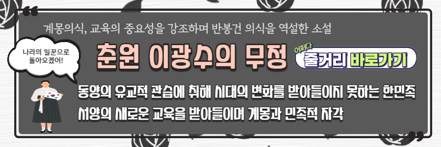 | 춘원 이광수의 무정 줄거리 요약 독후감 (1) | 2024.10.24 |