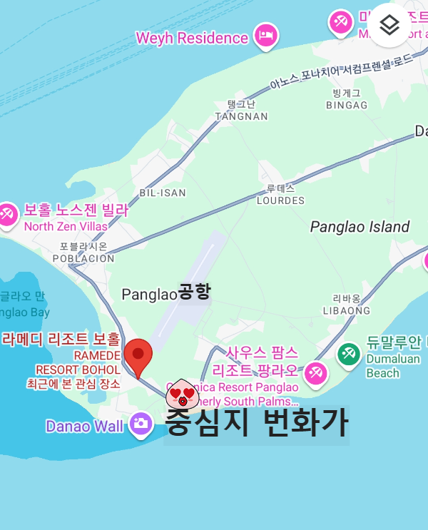 해난 타왈라 리조트는 맥도날드 근처에 위치했으며 진짜 번화가랑 가깝다. 숙소에서 놀다가 걸어서 바로 나올 수 있는 거리이다. 햄버거 먹으러 나오기도 쉽고, 알로나비치로 놀러나가기도 가깝다. 환전하거나 슈퍼가기도 편하다. 번화가에 있다보니 위치가 너무 좋다.