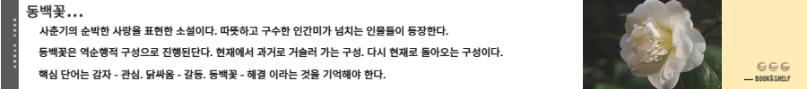 동백꽃은 사춘기 시절의 순박한 사랑을 표현한 소설이다. 이 소설 통해 그 시대의 빈부격차를 보여주고 있다. 마름의 딸인 점순이와 소작인의 아들인 나! 위에서 내려보는 점순이의 위치와 자빠져있는 나는 밑에서 위에 있는 점순이를 올려보는 구도로 알 수 있다. 동백꽃은 현재에서 과거로 거슬러 이야기하는 구성에서 다시 현재로 돌아와 이야기하는 구성으로 되어 있다. 이를 역순행적 구성이라고 한다. 이 소설의 핵심단어를 기억해 두면 문제풀이에 도움이 된다.