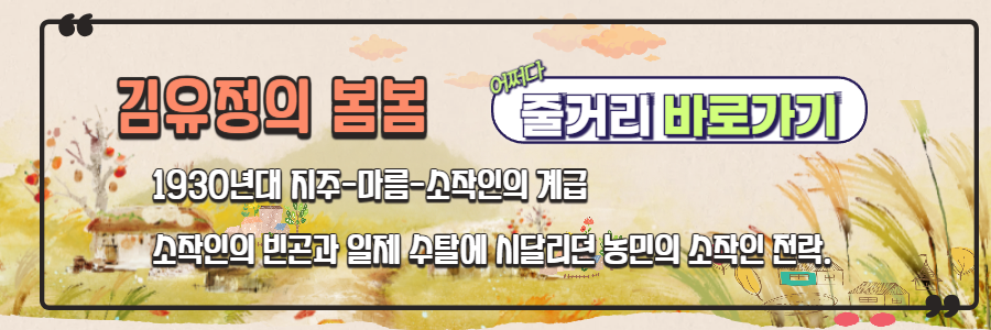 이 상황이 분하고 억울해서 울어버렸다. 나만 혼나고 끝나는 일이 아니고 소작농인 부모님과도 연결된 문제였다. 하지만 점순이는 아무렇지 않은 듯, 별일 아니라는 듯, 신경 쓰지 말란다.