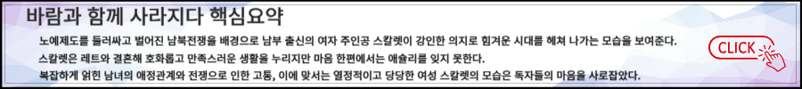 [ 바람과 함께 사라지다]는 미국의 작가 마거릿 미첼이 10년 동안 만든 소설이다. 이 소설은 노예제도에 대한 가치 판단과 갈등으로 벌어진 남북전쟁을 배경으로 하고 있다. 애틀랜타에서 태어난 작가는 어릴 때부터 아버지에게 남북전쟁에 대해 들었다. 그래서 아버지에게 들은 이야기와 그녀가 조사한 전쟁 자료들을 바탕으로 소설을 완성하게 된다. 10년 만에 1000페이지가 넘는 대하소설을 탄생시킨 것이다. 1936년 발간되자마자 100만부가 넘게 팔릴 정도로 폭발적인 인기를 끌었다.