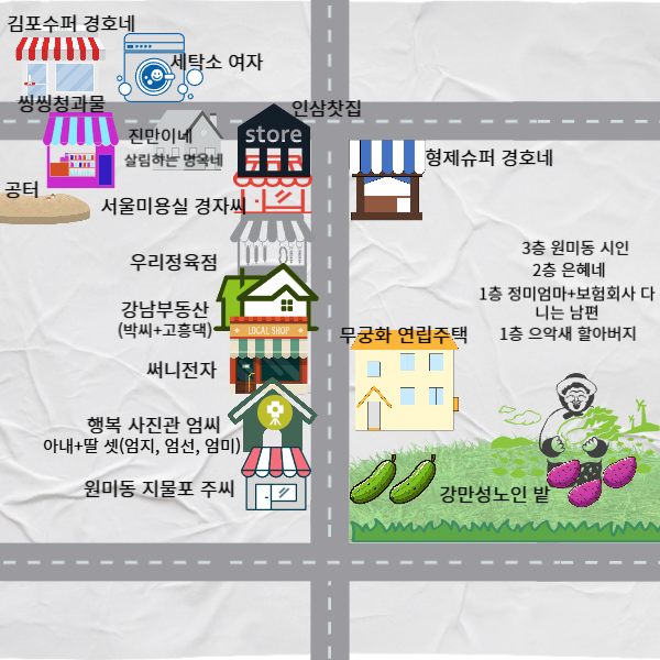 • 원미지물포 주씨 : 과거 부산에서 미장이 기술자였다. 지금은 부천시 원미동에서 지물포를 차렸다. 우락부락하지만 듬직한 성격. 큰 아이 이름은 상수이다.