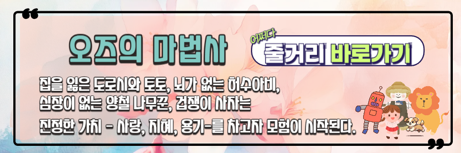 오즈의 마법사를 읽으면서 궁금했다. 서쪽마녀는 진짜 물 맞고 죽었을까? 막강한 마녀인데 고작 약점이 물 한 바가지라고? 이렇게 허무하게 사라지나? 궁금했는데 위키드 완결을 보면 궁금증이 풀릴 것 같다. 다음 편은 언제 나올까?