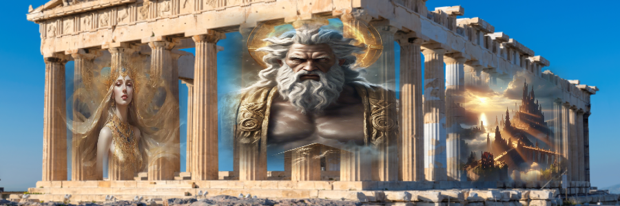 올림포스 산꼭대기에는 신들의 궁전이 있고 여기는 신들의 왕 제우스와 헤라가 산다. 제우스는 엄청난 위력의 번개와 아들 헤파이스토스가 만들어 준 방패 옷 때문에 누구도 넘볼 수 없을 정도로 강했다. 헤라는 정숙하고 도도한 아름다움을 가졌다. 그녀는 언제나 자신의 의견을 조리 있게 말하며 기품을 잃지 않았다. 헤라는 결혼과 출산에 관한 모든 일을 돌본다. 그들 사이에는 공식적으로 세명의 자녀가 있었다.