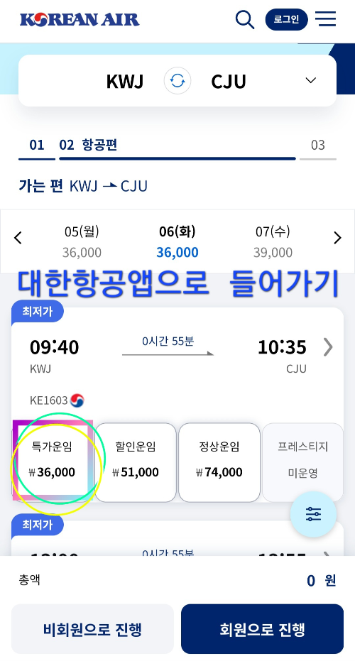 항공사와 시간표를 확인했다면 항공사이트로 이동한다. 대한항공 특가석을 확인한 다음, 대한항공 앱으로 가서 항공편을 찾아 예약한다. 웹투어는 여행사에서 운영하는 예약서비스로 수수료 천 원이 있다. 웹투어에서 바로 예약하면 왕복예약이 쉽고, 예약 확인 역시 쉽다. 단, 취소할때도 수수료가 들고, 변경은 불가하다. 여행이 확실하지 인원이 포함되어 있다면 따로 예약하는 것이 좋다.