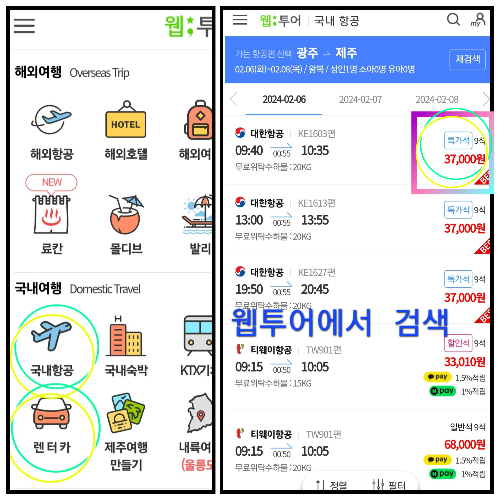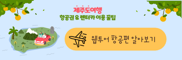 제주도는 비수기(한겨울)에 여행 가면 항공권, 렌트, 숙박을 저렴하게 이용할 수 있다. 성수기(한여름)에 가려면 특가를 잡아야 하니깐 미리미리 예약해야 한다. 중요한 항공권 알아보기. 항공권 예약 앱을 통해 시간표와 가격을 한눈에 확인한다. 나는 웹투어를 주로 사용한다. 가끔 웹투어(여행사)에 특가석이 남아있는 경우가 있다.