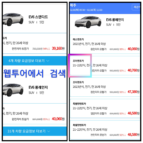 웹투어에서 렌트카를 검색한다. 차종과 가격별로 나열된다. 확인 후, 빌리카로 이동하여 같은 차종으로 가격비교를 한다. 보통 빌리카에서 예약하는데, 이번에는 쿠폰 때문에 웹투어를 통해 조아렌터카를 이용해 보았다. 조아렌터카는 4만 원으로 되어있지만, 보험료가 빠진 가격이다. 렌트할 때, 일반보험 4만원과 슈퍼보험 8만 원을 선택 후 추가요금 내야한다.