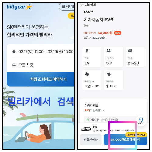 빌리카는 완전자차 보험료 2만원 추가해야 한다. 가격차이는 크게 나지 않지만, 쿠폰을 이용해도 빌리카가 저렴했다