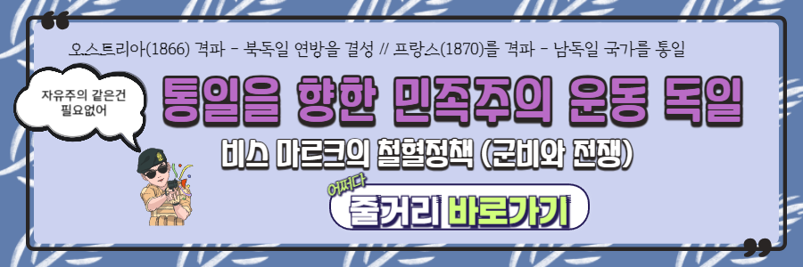 독일은 비스마르크(프로이센 수상 1862~1890)의 철혈 정책 추진으로 1871년 통일한 후, 뒤늦게 식민지 쟁탈전에 뛰어든다. 빌헬름 황제(1888)는 독일의 3B정책(베를린, 비잔티움, 바그다드)으로 영토 확장을 위한 팽창정책을 추진한다.