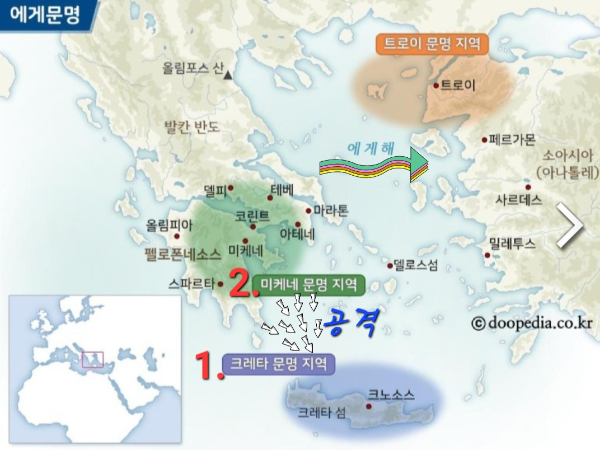 에게해 문명은 크레타섬에서 발생환 그레타 문명과 그리스본토에서 발생한 미케네 문명이 있다. 이때 터키(지금은 튀르키예)가 있는 소아시아 지역이 페르시아 대제국이 있었다. 그리스는 피어나는 새싹 정도!